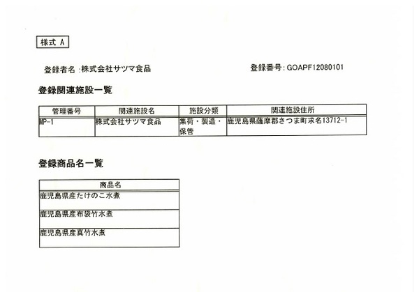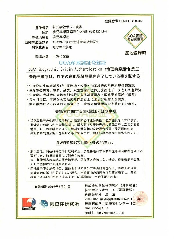 「生育地の科学的指紋」である安定同位体比を分析し産地を特定する、最新の科学的産地証明です。弊社が製造出荷している「鹿児島県産たけのこ水煮」は産地データを登録しておりますので、GOA認証によって科学的に鹿児島県産を証明できます。