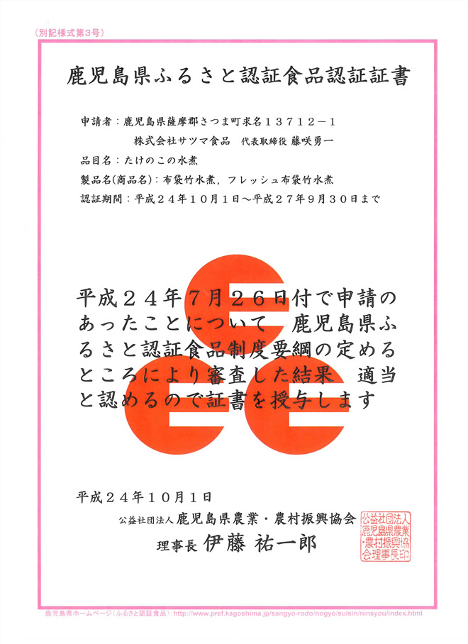 ふるさと認証食品(Eマーク)とは、鹿児島県の原材料の良さを活かして県内で製造された食品のうち、鹿児島県が定めた基準に合格したものにのみ与えられる、優れた品質と信頼の証です。